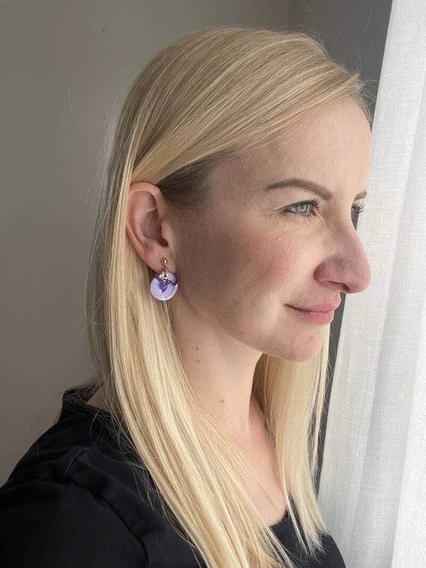 Kleine, lila/weiß marorierte Ohrringe aus leichtem Polymerton mit Blattgoldveredelung sind die "dezentere" Variante der großen Hängeohrringe.