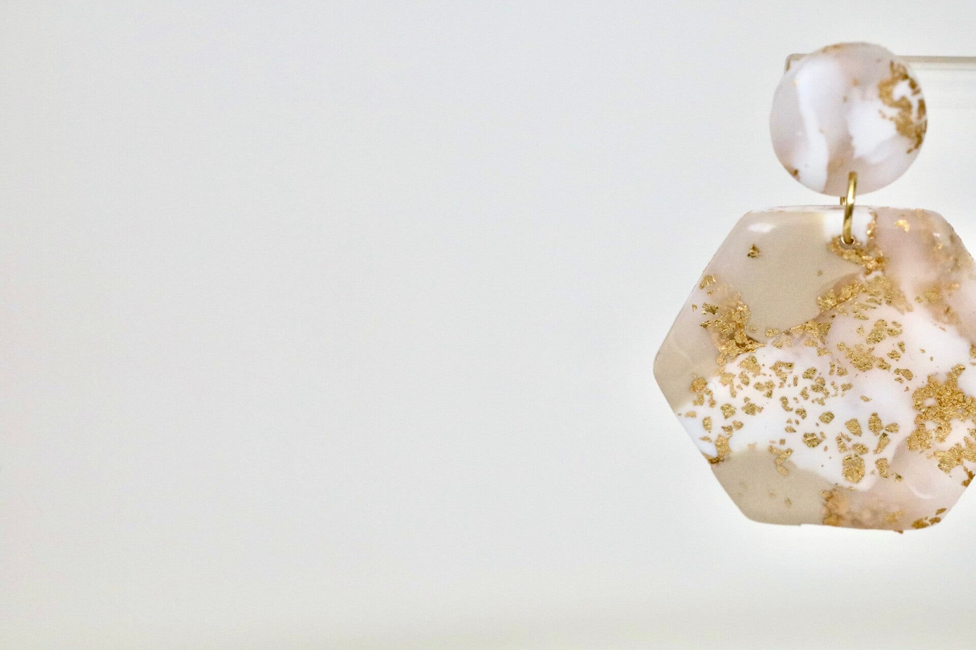 Wunderschöne, gold/weiß/beige marmorierte Polymertonohrringe in Hexagon Form veredelt mit Blattgold. Durch das Leichtgewicht des Polymertons sind die Ohrringe sehr leicht und bieten einen angenehmen Tragekomfort.