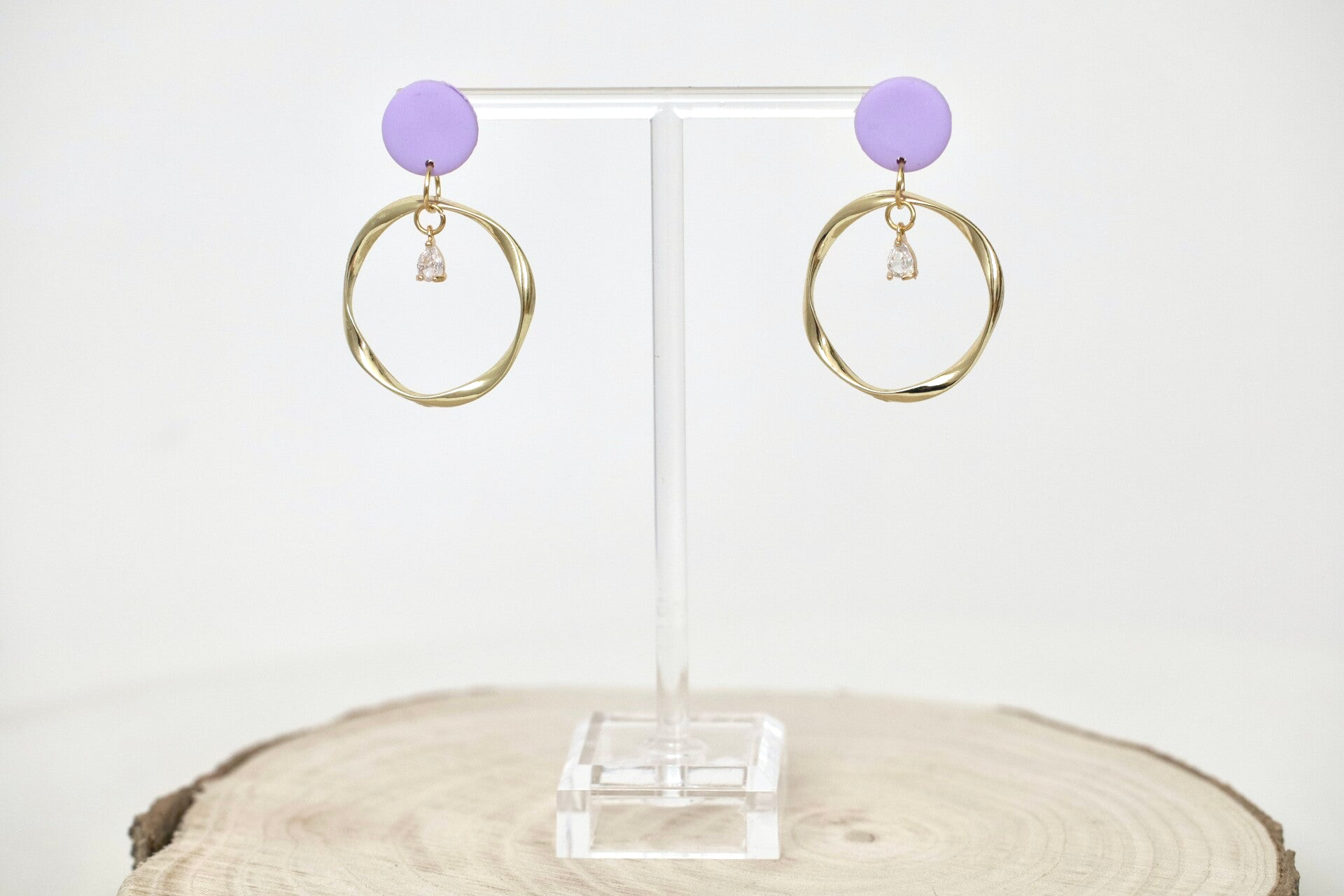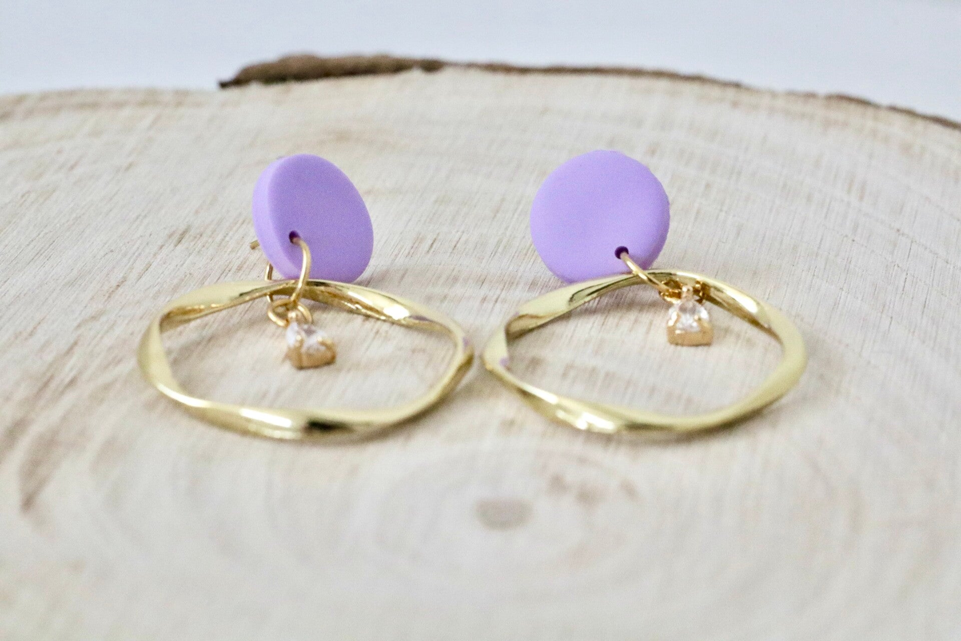 Diese edlen, lila Polymertonohrringe mit Goldring und zartem Zirkoniaanhänger sind ein perfektes Accessoire für elegante Anlässe.