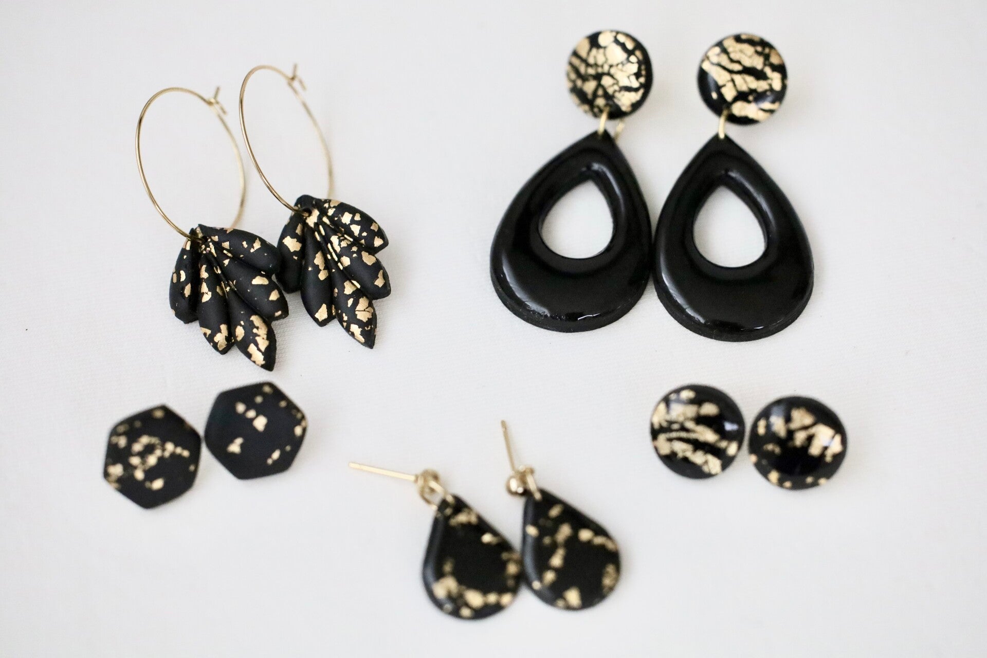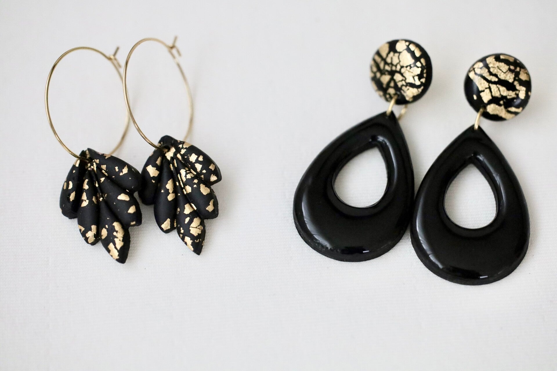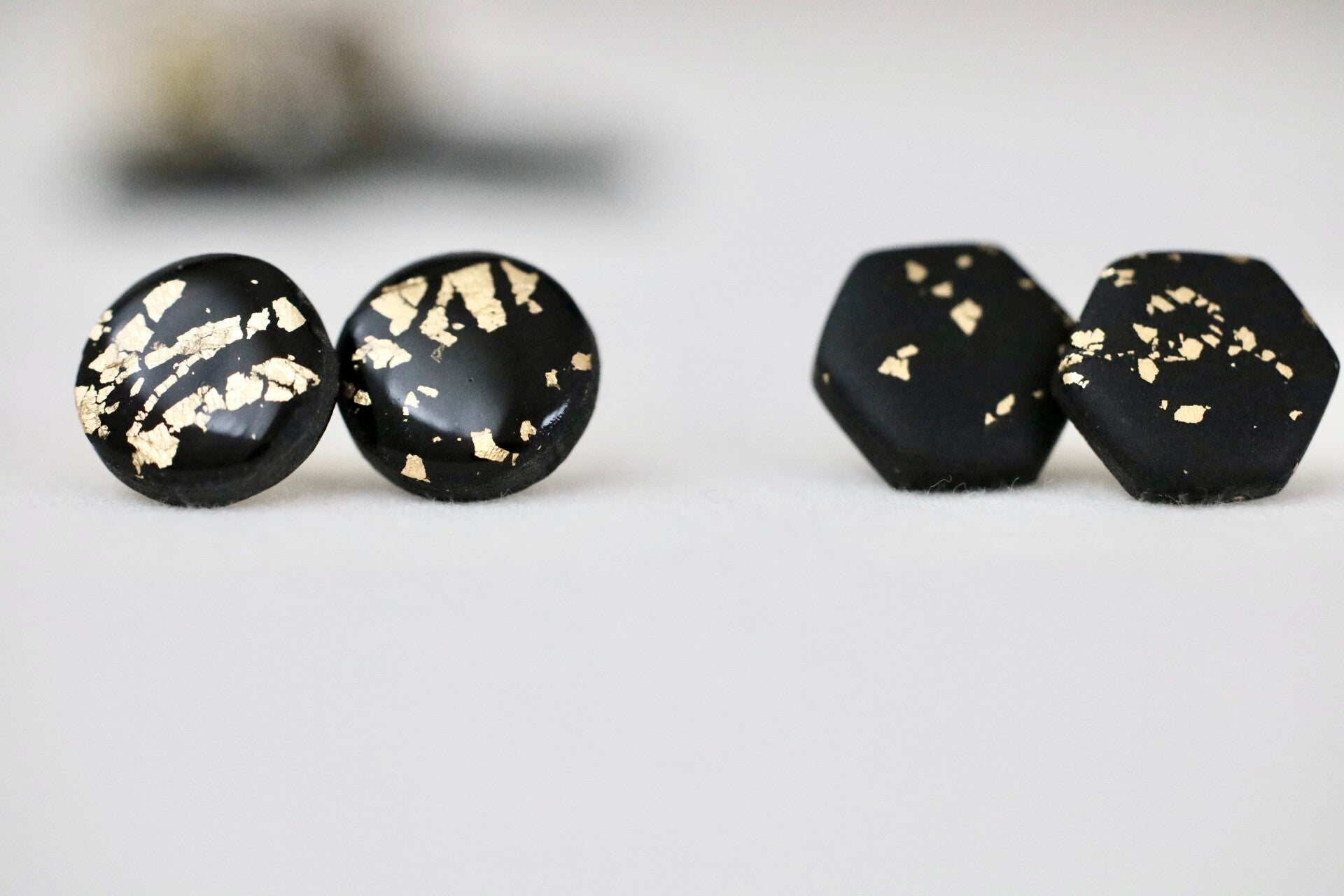 Die Polymertonohhringe in schwarz sind mit Blattgold veredelt und je nach Modell in Hochglanz versiegelt.