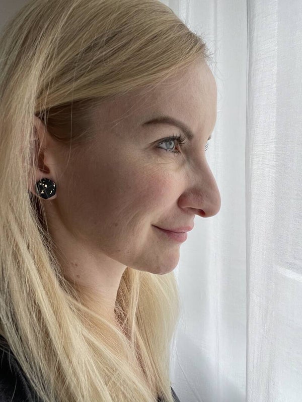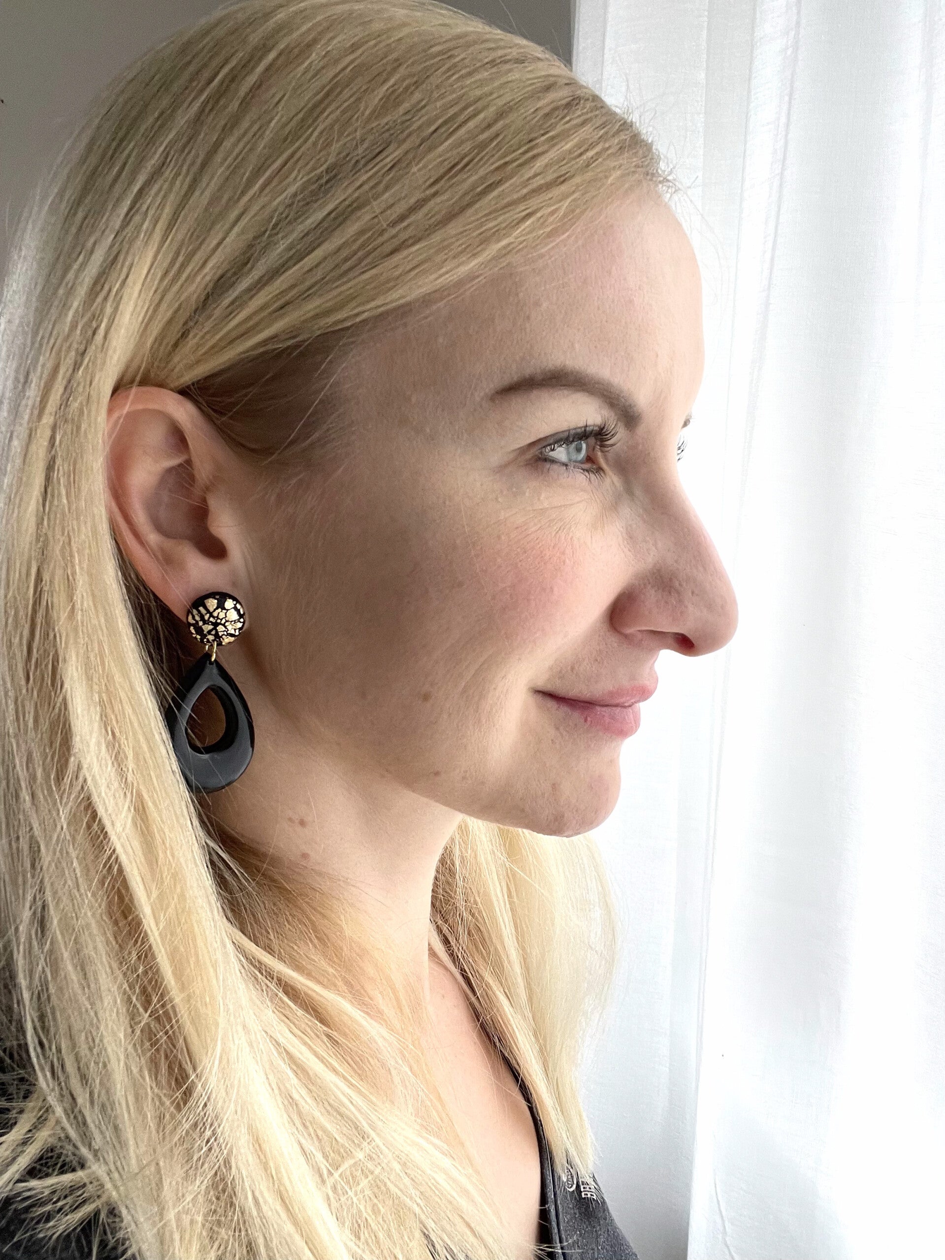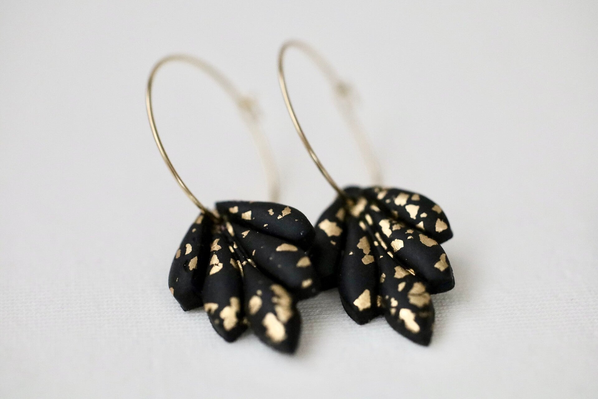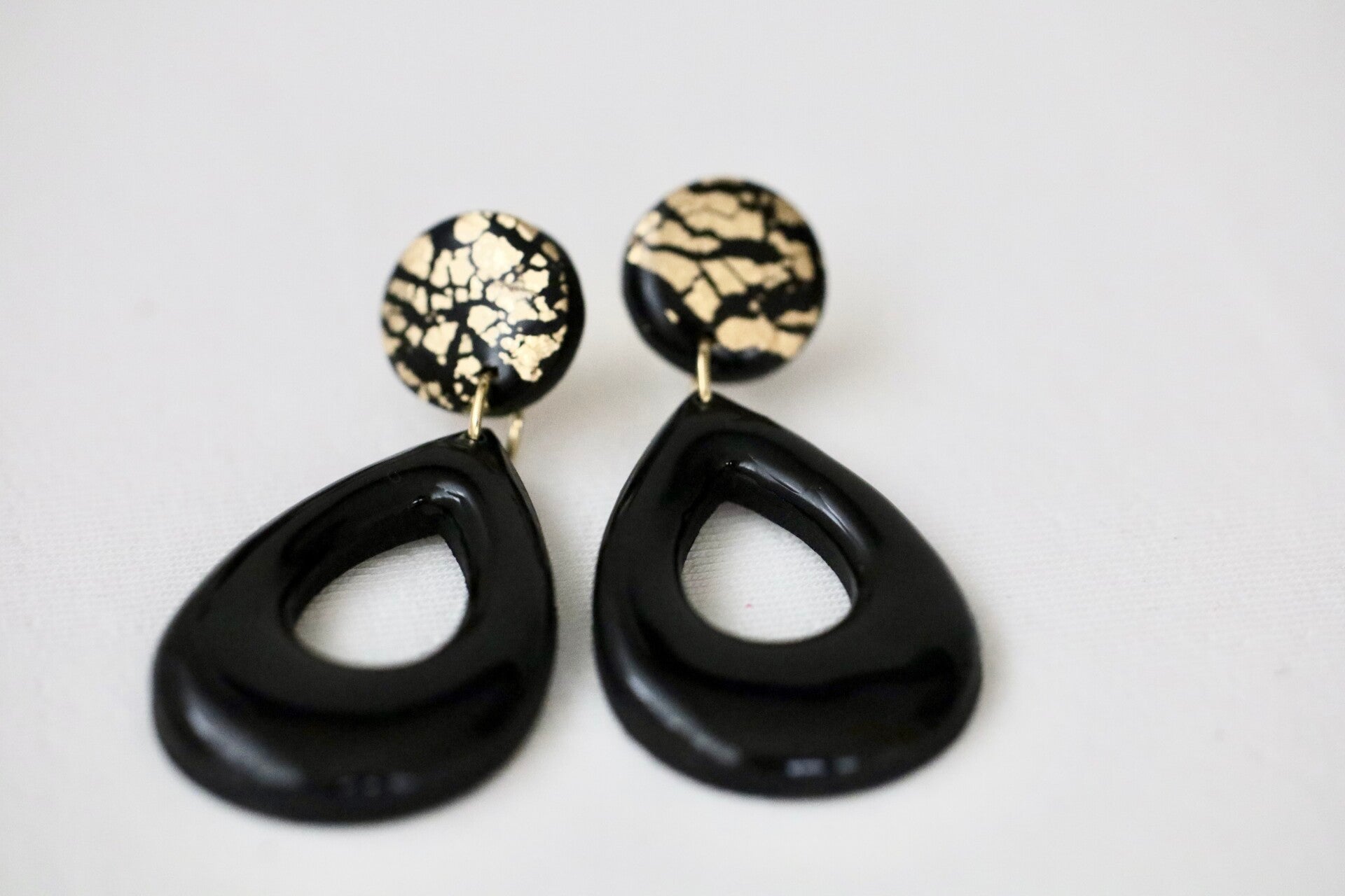Die Polymertonohhringe in schwarz sind mit Blattgold veredelt und je nach Modell in Hochglanz versiegelt.