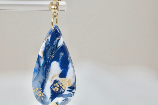 Elegante & einzigartige Tropfenohrringe in Marmoroptik in dunkelblau, weiß, gold und Hochglanzversiegelung. Edelstahlohrstecker vergoldet, allergikerfreundlich.