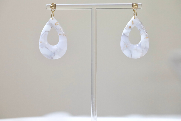 Schöne, elegante Marmorohrringe in Weiß/Gold, bestehend aus einem Polymertonanhänger in Tropfenform und einem vergoldeten Edelstahlohrstecker.