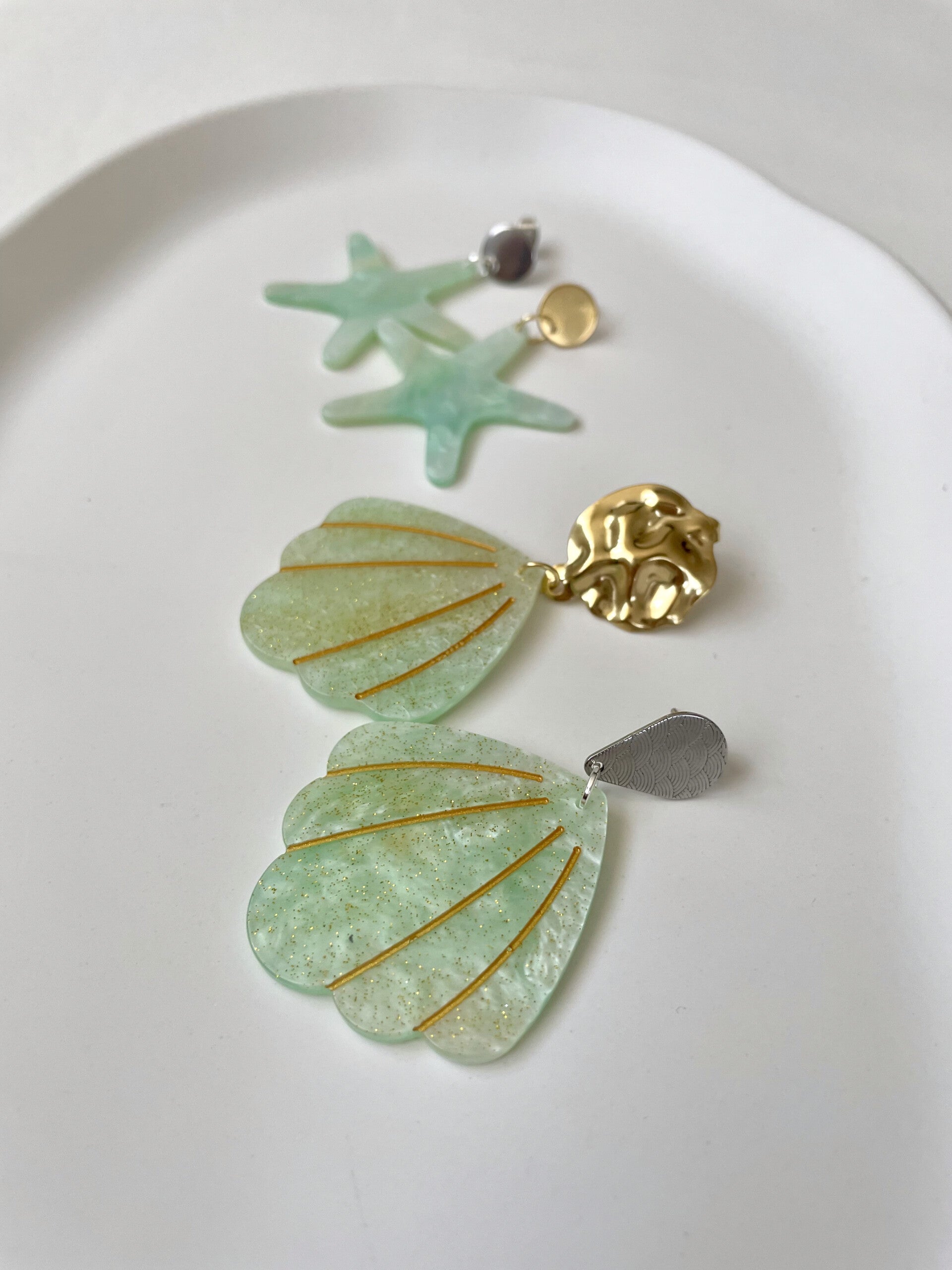 Sommerliche Muschelohrringe / Seesterne für deinen perfekten Sommerauftritt! Die Anhänger haben einen edlen Perlmuttglanz mit Glitzer in MINT und sind sehr leicht.