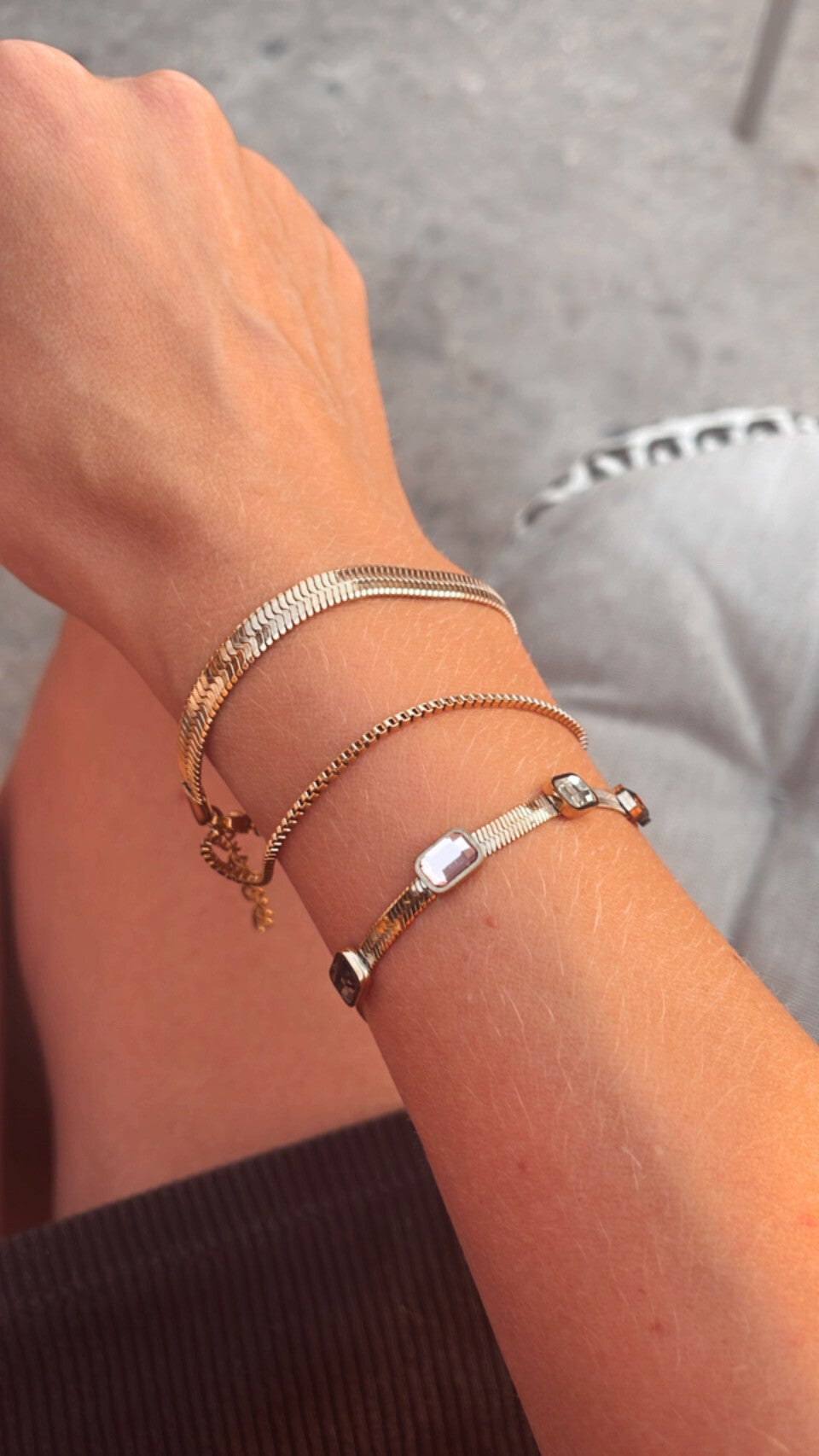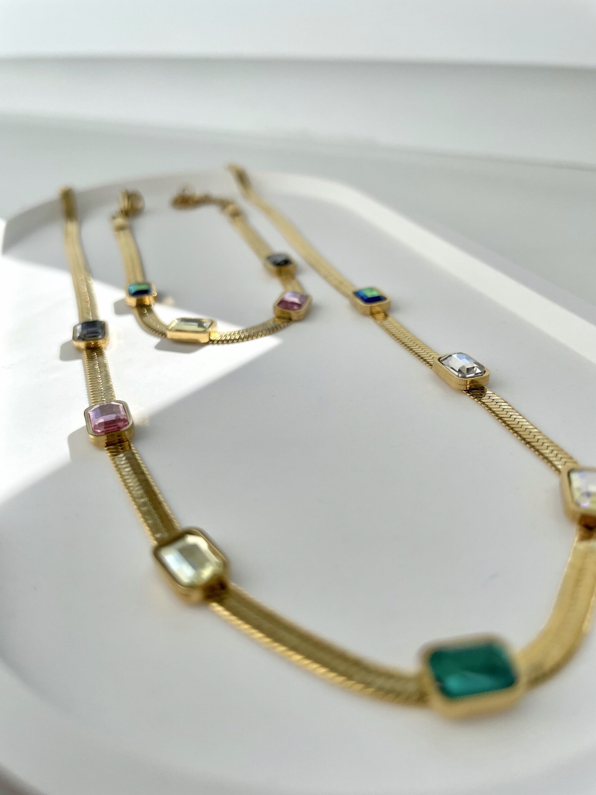 Funkelnde Schlangenkette & Armband ELISA mit bunten Glassteinen besetzt, machen dein Outfit zu einem Highlight. Der pinke Glasstein reflektiert im Licht grün je nach Winkel.