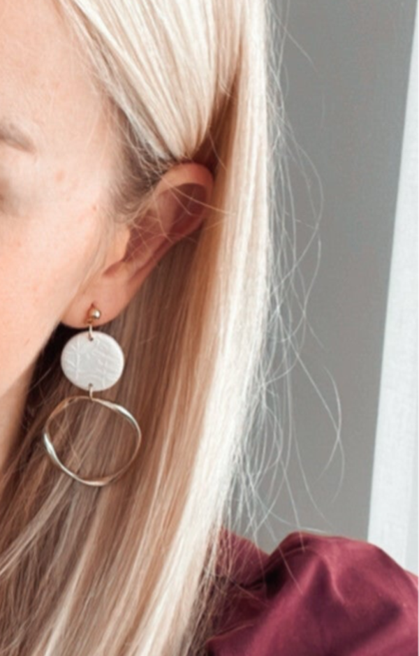 Elegante Hängeohrringe GLORIA mit floralem Polymertonanhänger und goldenem Edelstahlelement. Diese Ohrringe peppen deine Outfits richtig auf, egal ob im Alltag, am Abend oder zu feierlichen Anlässen.
