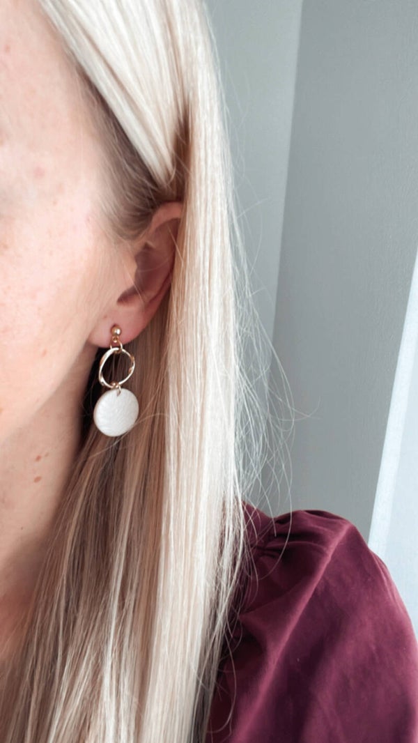 Elegante Hängeohrringe GLORIA in kleiner Ausführung, mit floralem Polymertonanhänger und goldenem Edelstahlelement. Diese Ohrringe peppen deine Outfits richtig auf, egal ob im Alltag, am Abend oder zu feierlichen Anlässen.