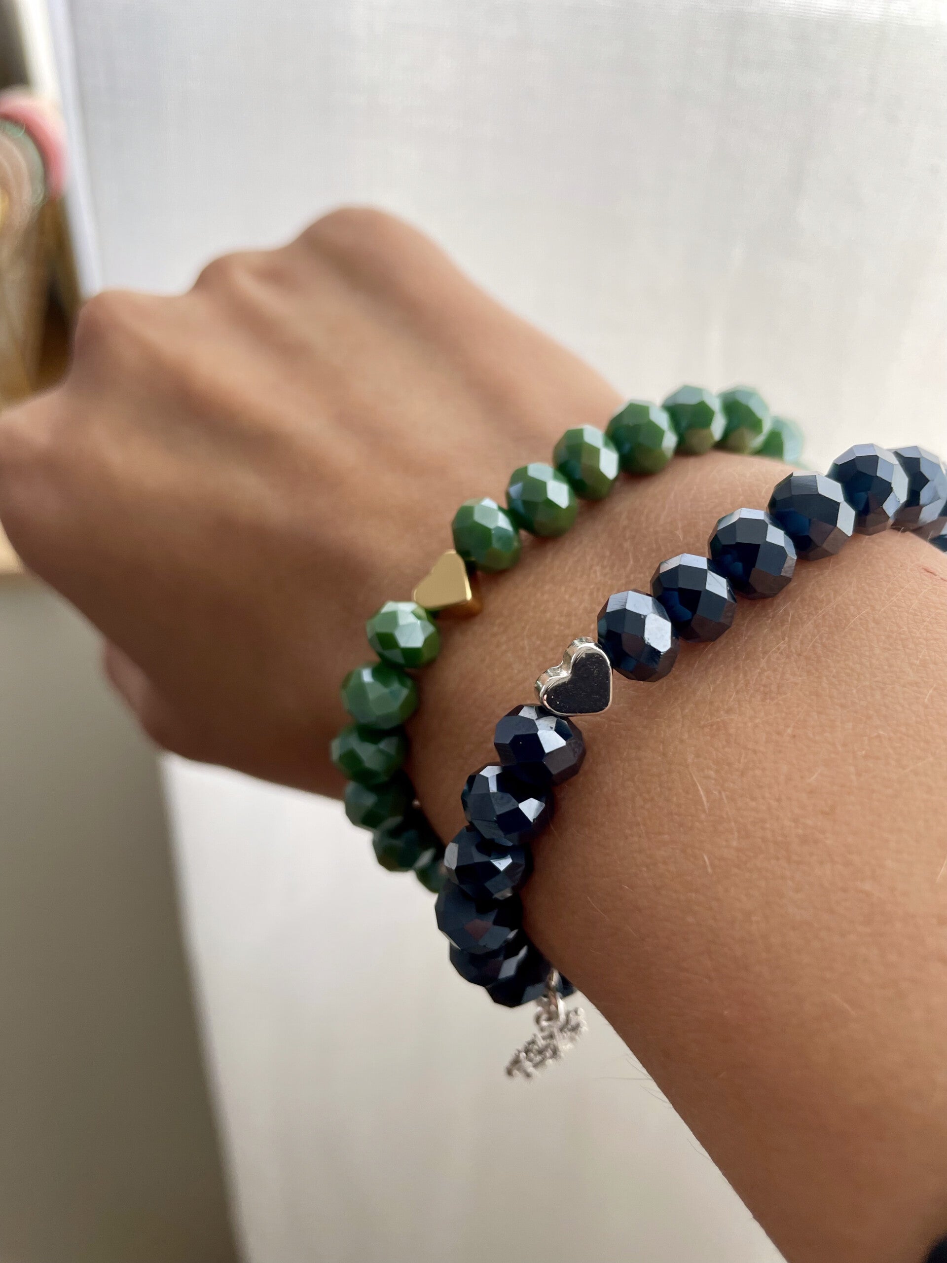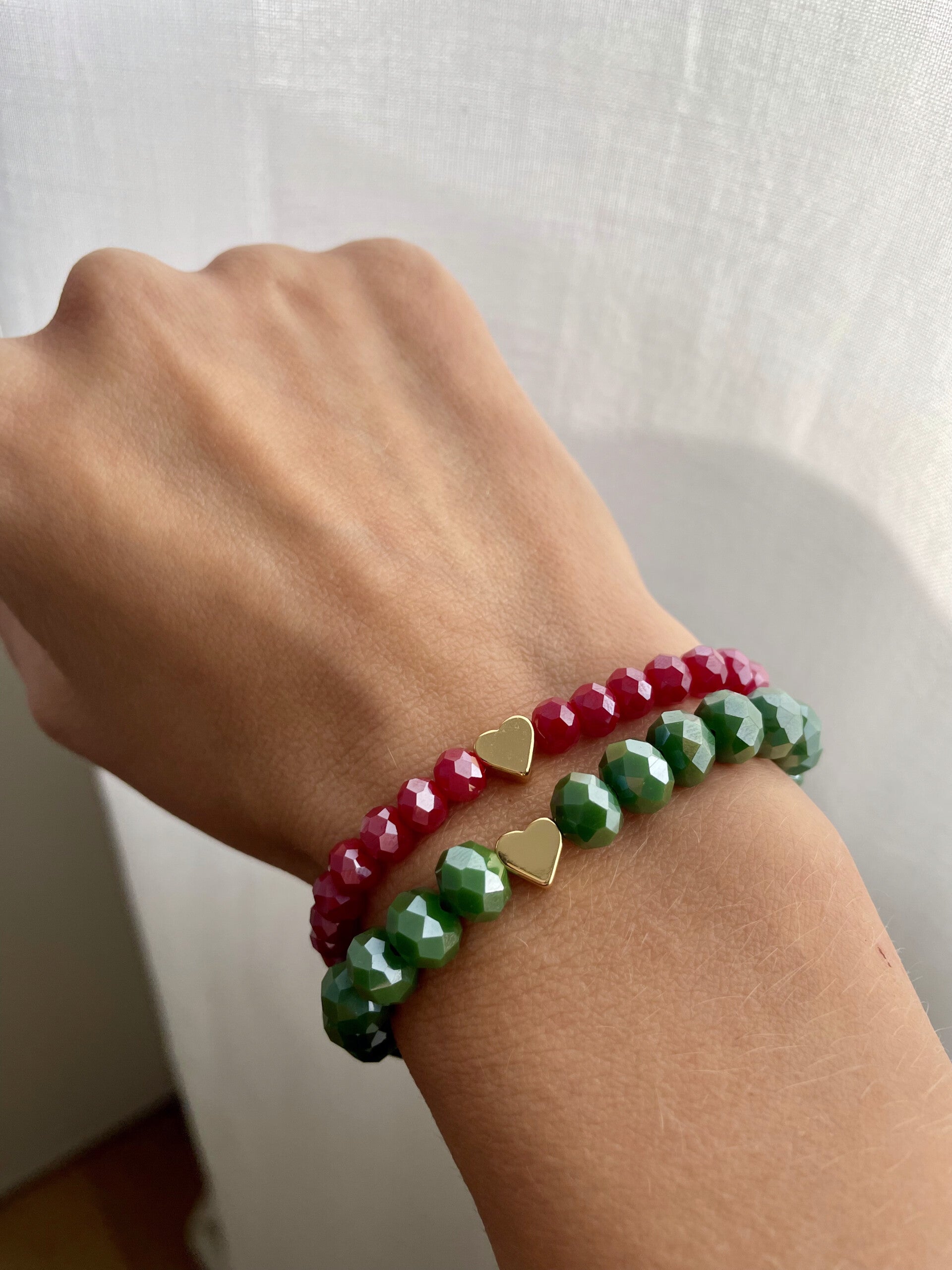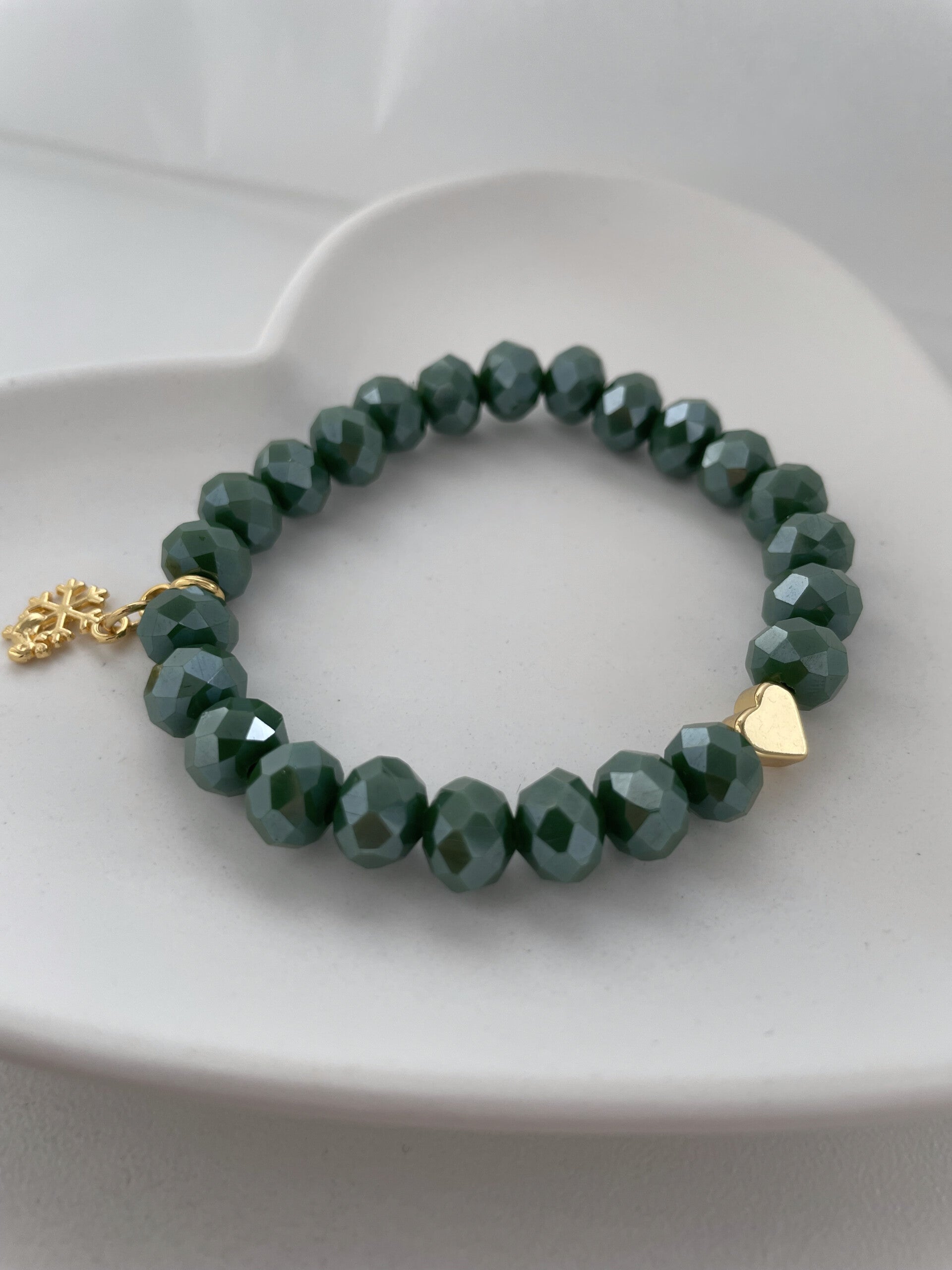 Funkelndes Winterarmband aus Facettperlen gefädelt, mit goldener Herzperle aus Edelstahl und einem kleinen Schneflockenanhänger mit Rentier, macht dein Outfit zu einem Hingucker.