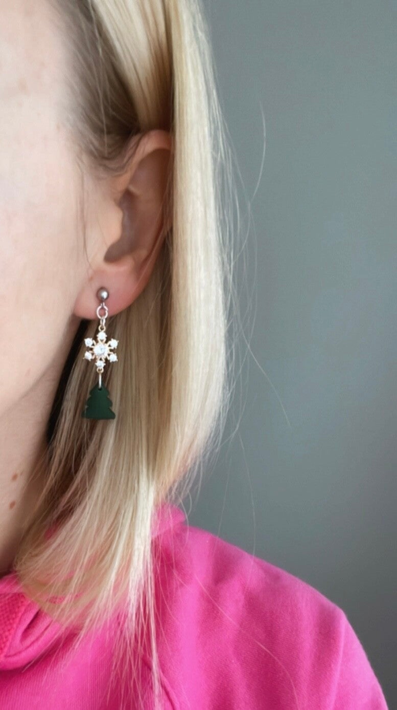 Weihnachtliche Ohrringe bestehend aus einem Edelstahlohrstecker (silber oder vergoldet) einem Zirkoniaschneestern und einem Tannenbaumanhänger aus Polymerton geben deinem Outfit einen einzigartigen Look.