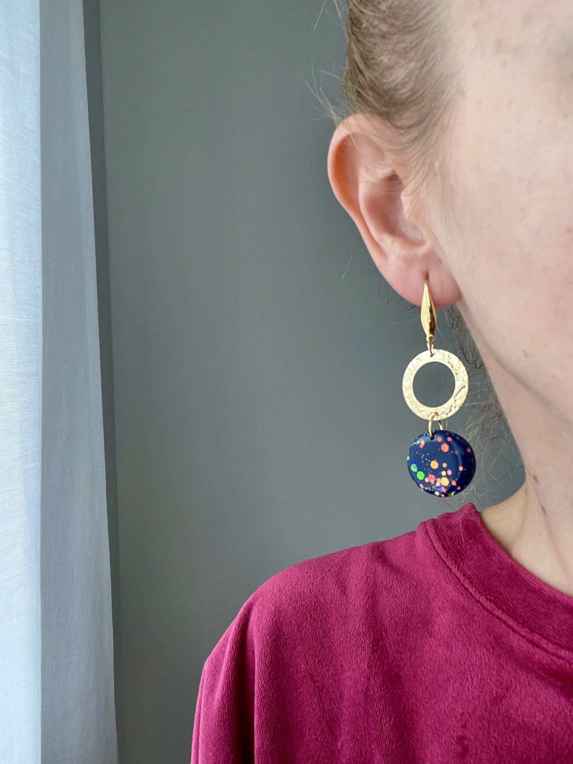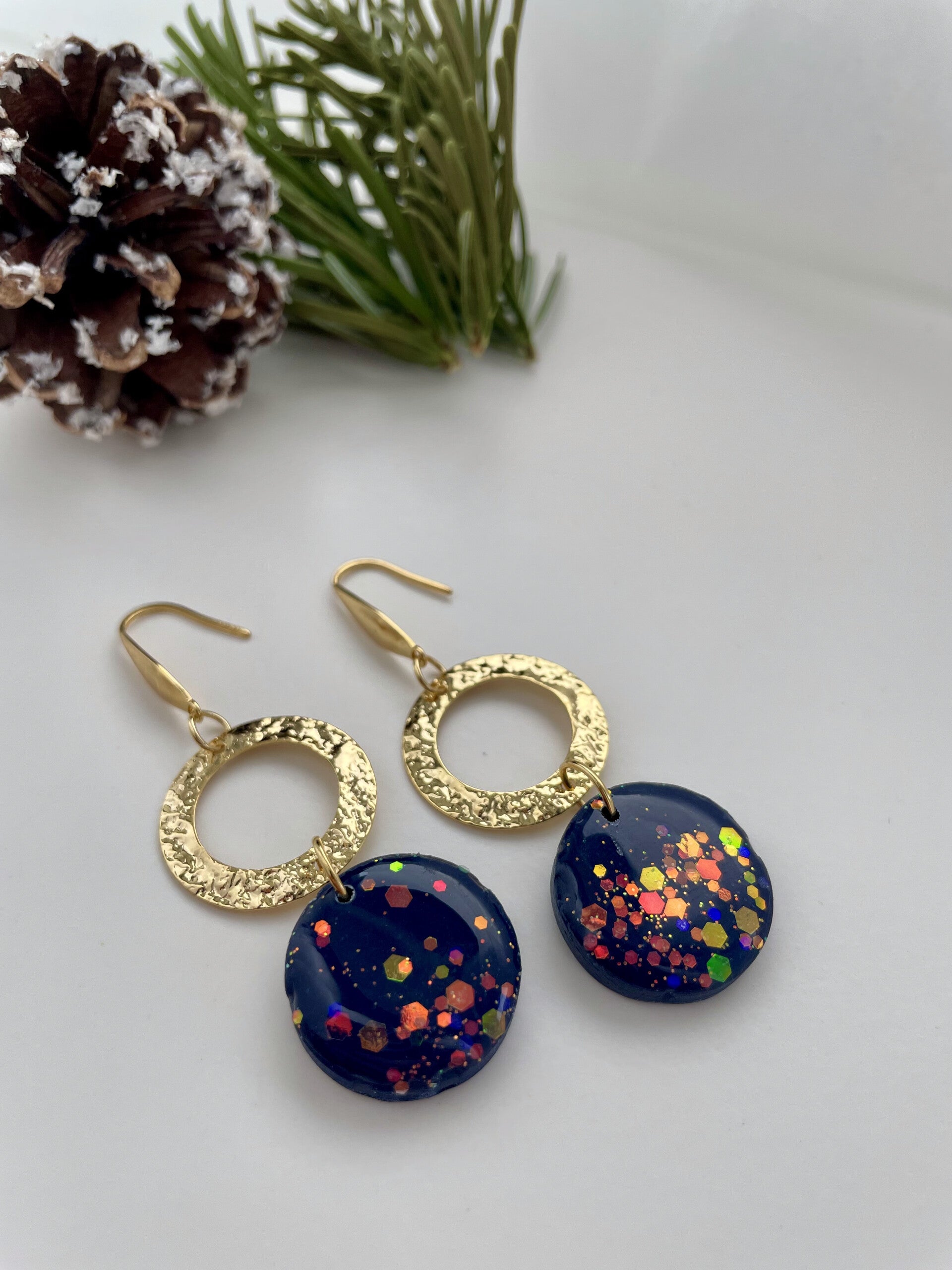 Die Luna Kollektion bezaubert durch ihre elegante dunkelblaue Farbe. Je nach Modell sind die Ohrringe mit Blattgold oder schimmernden Glitzerflocken veredelt. Die Ohrstecker sind aus vergoldetem Edelstahl und allergikerfreundlich.