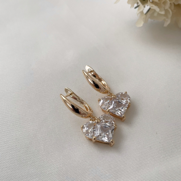 Zirkonia Ohrringe mit Herzanhänger, 18K vergoldet.