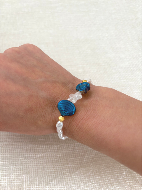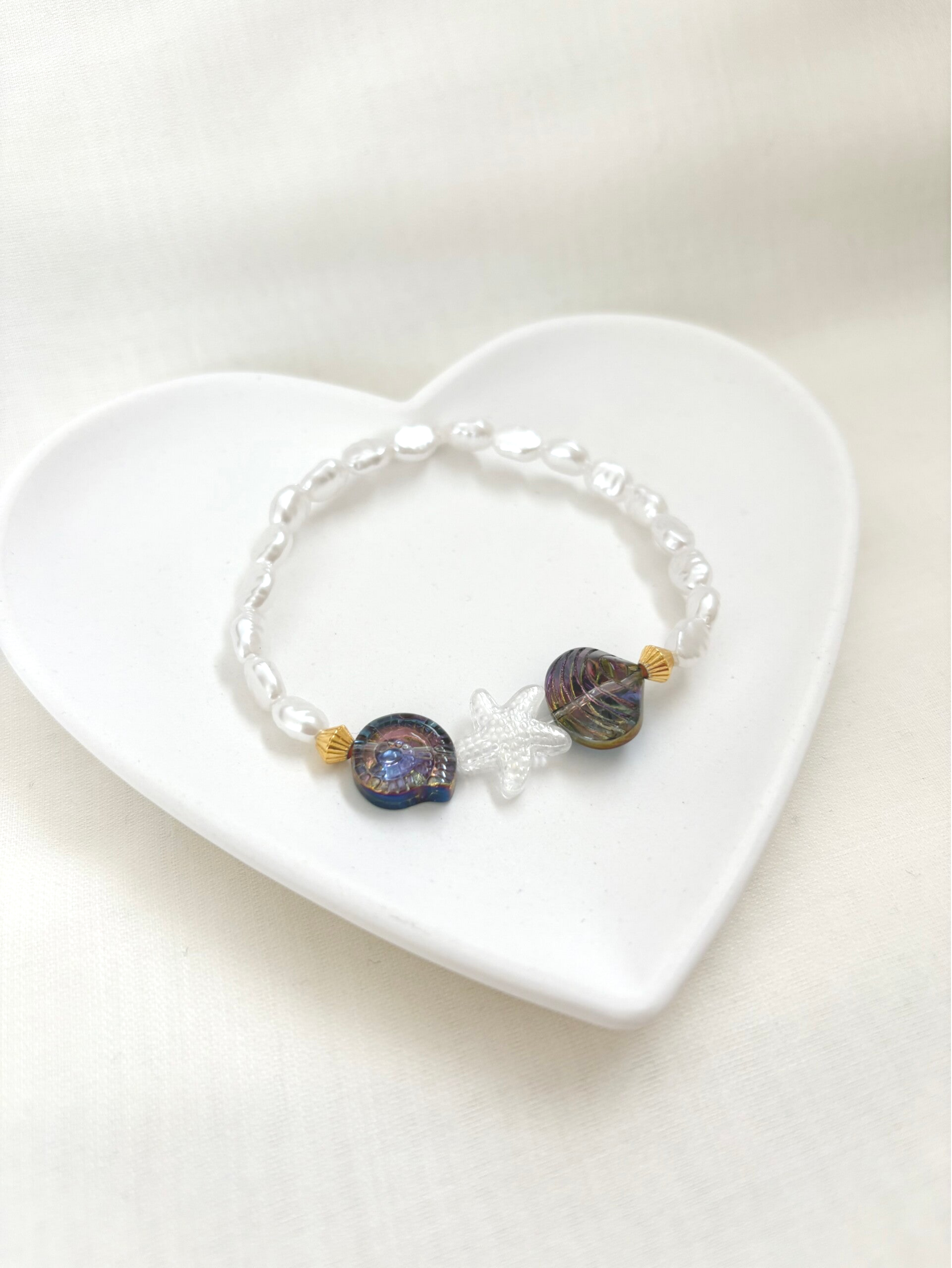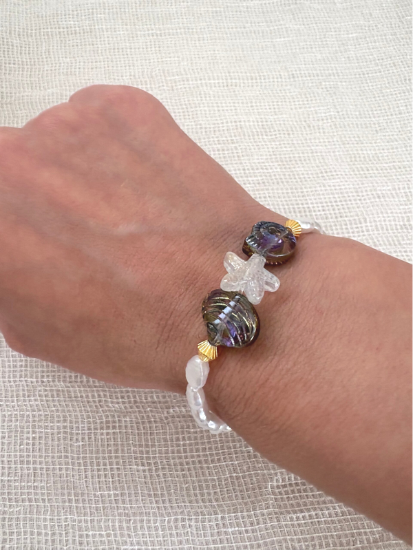 Sommerliches Armband SIRENA mit drei Glasperlen in Muschel- und Seesternform. Die Perlen sind wendbar sodass sie im Lila- oder Blauton funkeln.